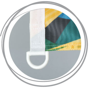 Pour le pavillon : cousu en double piqûre rabattue, guidant avec ganse de renfort et deux boucles plastiques.