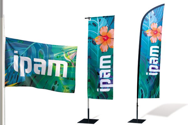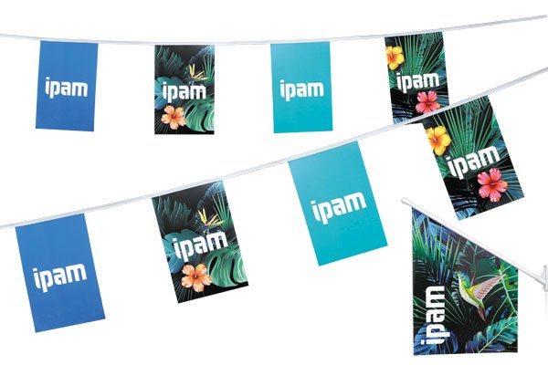 Ipam imprime Banderoles, kakémonos, calicots, cache palette, bas de palette, jupes de TG, fanions sur potence, guirlandes de fanions, nappes, bandes de balisage, wind...