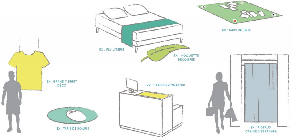 Nos matières, techniques d’impression et de découpe, permettent la réalisation de supports toujours plus innovants et personnalisés : t-shirt, tapis de souris, PLV literie, moquette découpée, tapis de jeux, tapis de comptoir, rideaux de cabine d’essayage.