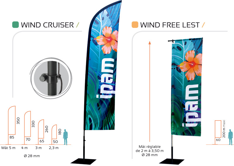 Mât 5 m : H 350 cm x L 85 cm Mât 4 m : H 330 cm x L 70 cm Mât 3 m : H 260 cm x L 65 cm Mât 2,3 m : H 180 cm x L 50 cm |