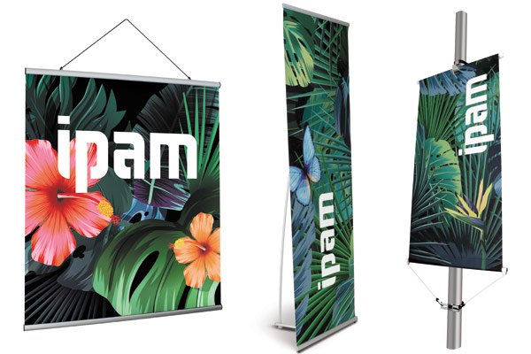 Ipam imprime Banderoles, kakémonos, calicots, cache palette, bas de palette, jupes de TG, fanions sur potence, guirlandes de fanions, nappes, bandes de balisage, wind...