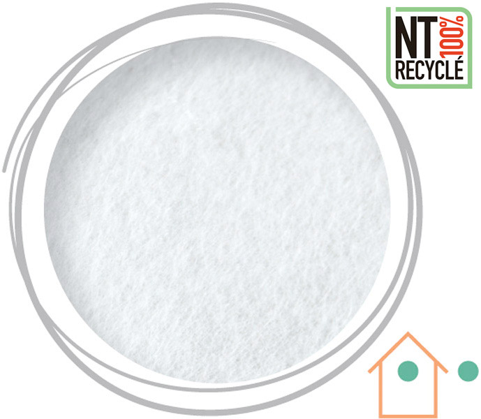 Depuis 2021, nous sommes fiers d’imprimer sur de l’intissé / Non-tissé composé de fibres 100 % recyclées fabriqué à partir de paillettes de plastique issues de bouteilles recyclées.